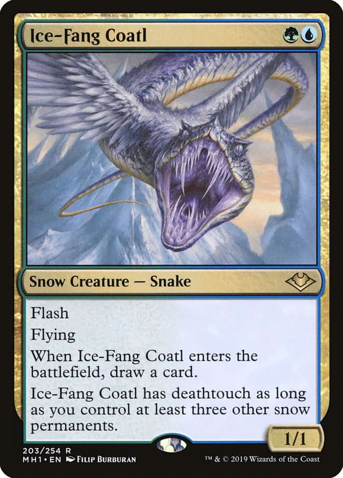 And so it began. I mulled to six for what felt like the billionth time while my opponent kept. He led with [Card]Eldrazi Temple[/Card] pass. I led with [Card]Fabled Passage[/Card] pass. He went E-Temple into a [Card]Thought-Knot Seer[/Card], man that’s a hot start but alright. I can’t remember what he took but I flashed in an Ice-Fang to block the TKS. I untapped and played a [Card]Field of Ruin[/Card] to hit one of his Temples and passed back. My opponent played a land into ANOTHER TKS, this time taking a [Card]Dead of Winter[/Card]. I untapped, played a land and passed back. My opponent played a land and then a [Card]Reality Smasher[/Card] and swung at me with everything. I flashed in a second Coatl and blocked both TKS’s taking five and drawing three (Coatl, TKS, TKS). I untapped and Trophied the Smasher (discarding a land) and played a big snowy tree. That was game one, Coatl is one heck of a card.