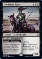 Next up, we have a completely different beast, inspired by the fact that [Card]Murderous Rider[/Card] has a creature attached to its [Card]Hero’s Downfall[/Card]. There are a lot of strange, Theros-style mana costs in Throne of Eldraine, leading me to the shocking conclusion that the Theros set coming out next year will include the “devotion” mechanic from the original Theros sets. If you are as clever of a sleuth as I am, and agree with this assessment, then a strategy along these lines could be a wise investment, especially if you’re less concerned about having the most tier one Standard deck possible, and more about playing an extremely fun mono-black midrange strategy that only stands to get better next year.