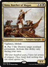 Vona, Butcher of Magan: I’ve registered this card in the past in Esper Control and been happy with it. But, it’s something that I just shelved completely after the printing of [Card]Hallowed Fountain[/Card] allowed the deck to reliably cast [Card]Lyra Dawnbringer[/Card]. Vona in current Esper is an inspiration from Edgar Magalhães and I believe it was a great inclusion in Week 1 of the format. The prevalence of [Card]Teferi, Time Raveler[/Card] currently makes me very skeptical of playing Vona against Esper or Bant Midrange so I think that I will be moving to [Card]Lyra Dawnbringer[/Card] to have the best threat against Mono-Red and White Weenie.
